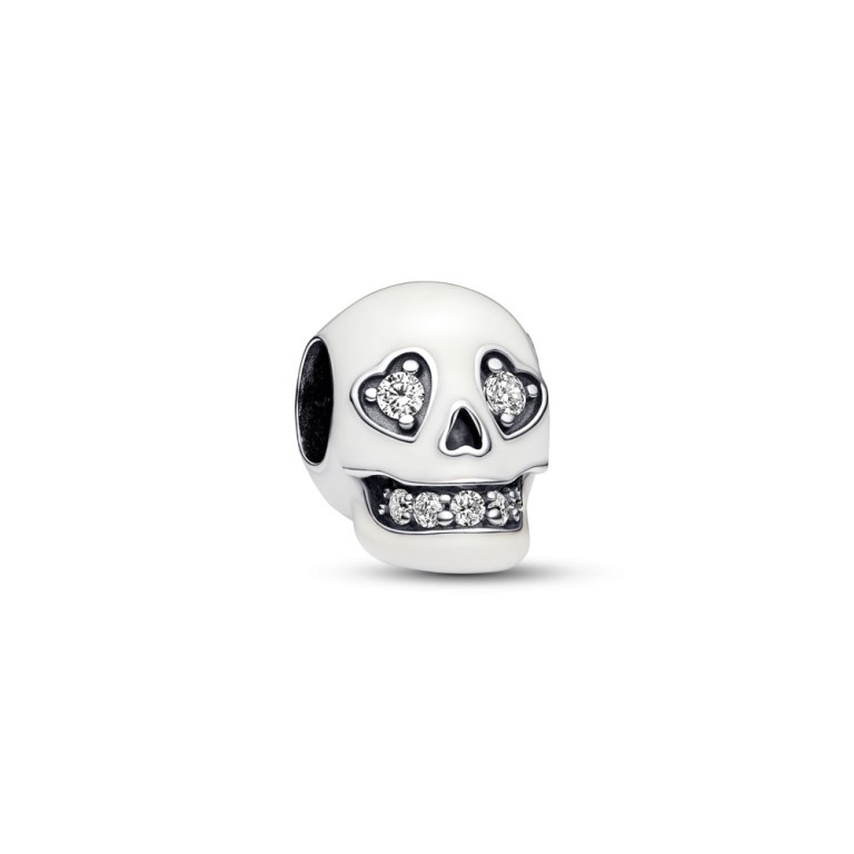 Dette charm i sterlingsølv forestiller et kranium, der er beklædt med selvlysende emalje med en mund og hjerteformede øjne, der funkler med sten i klar kubisk zirkonia. Udskårne detaljer pryder siderne af munden, næsen og bunden af kraniet.