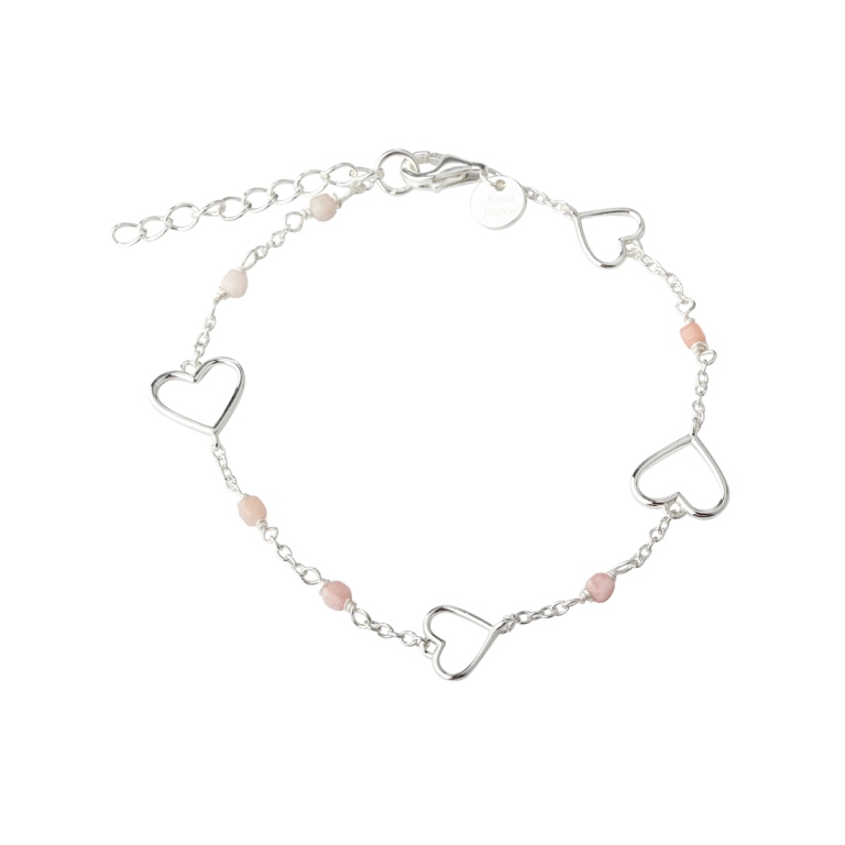 Flot armbånd med fire fine åbne hjerter og lyserøde stenperler, i forskellige nuancer. Elegant alene eller med andre smukke armbånd.