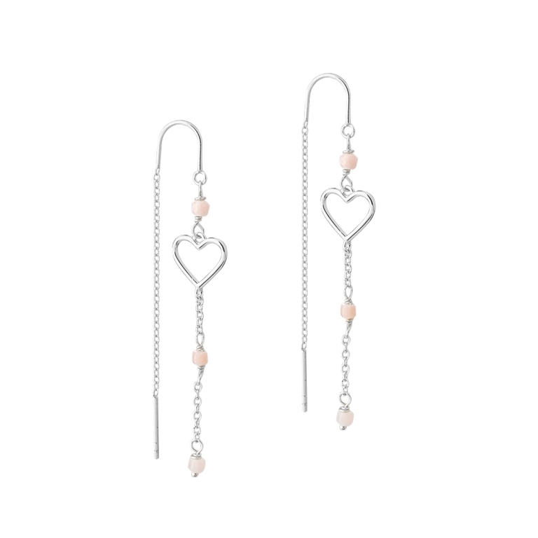 Flotte lange øreringe der med en kæde går gennem øret. Lavet i sterlingsølv med hjerte og lyserøde stenperler i forskellige nuancer.