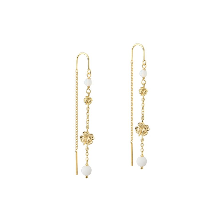 Elegante og fine øreringe med en lang kæde pyntet med fine kløvere og lyse stenperler.
