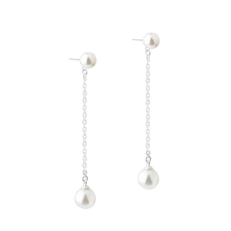 Smukke lange øreringe som består af en klassisk perleørestik hvorfra der hænger en dansende hvid ferskvandsperle i et kædestykke. En elegant og tidløs style som passer til ethvert outfit.