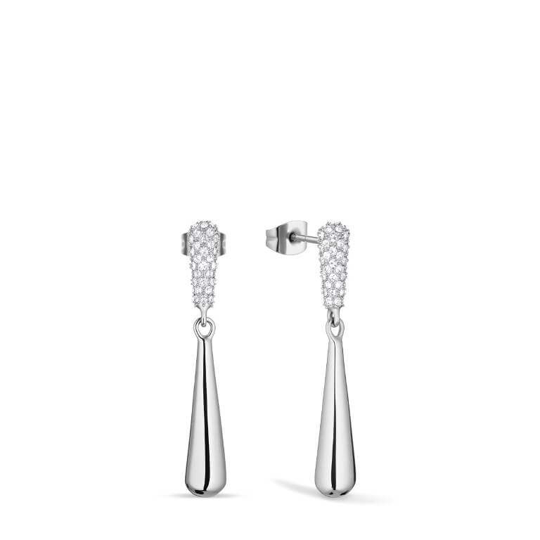 Øverst sidder en række glitrende zirkonia, der giver intenst lys. Under dem hænger et dråbeformet element i blankt rustfrit stål – elegant, glat og næsten vægtløst. Et samspil mellem lys, bevægelse og form, der gør disse øreringe til et symbol på diskret raffinement.