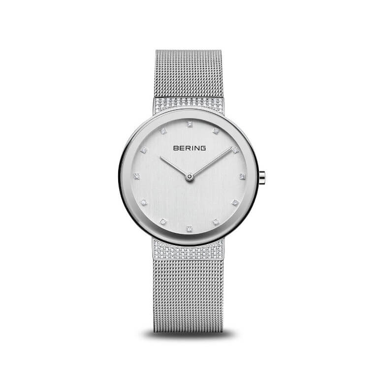 Elegant dameur fra Bering der udstråler elegance og eksklusivitet. Uret har ridsefast safirglas, sølvfarvet changerende skive samt funklende krystaller mellem lænke og kasse. Den ikoniske meshlænke i god kvalitet gør, at uret både er behageligt at have på samtidig med at den fuldender urets endelige design. Samtidig finder du glimtende klare krystaller på urets skive.