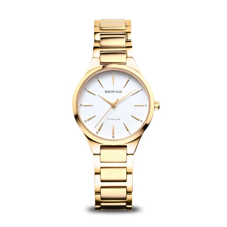 Bering dameur titanium stål gulddoublé lænke safirglas 30mm 10ATM