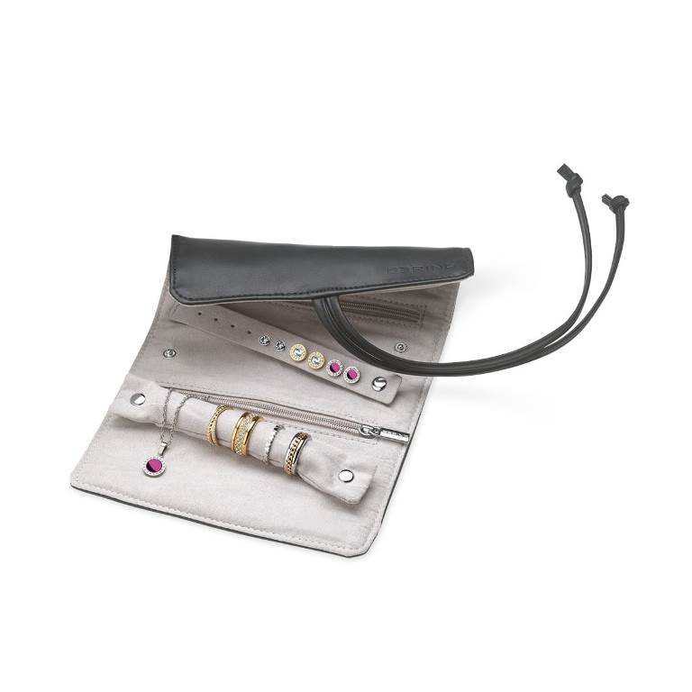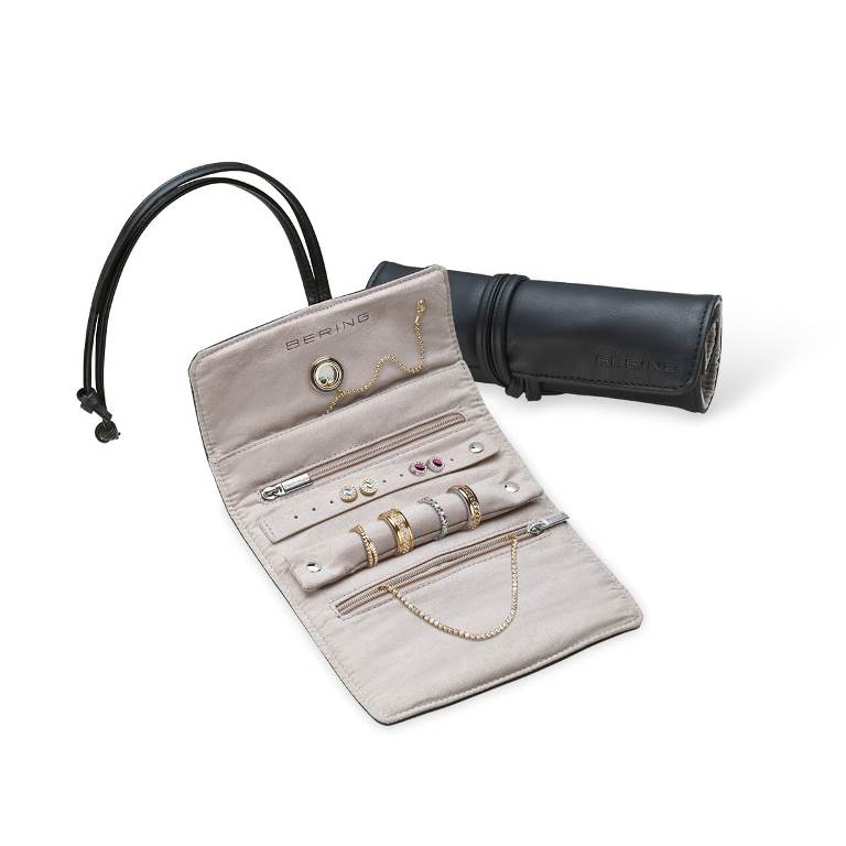 Elegant, funktionelt og gennemtænkt. Designet til sikkert og stilfuldt at opbevare dit smykke, kombinerer denne rulle design med funktionalitet. Den er lavet af fint mat sort kunstlæder, omgivet af en grå foring med prægede BERING-logoer, udstråler dette produkt ren elegance.