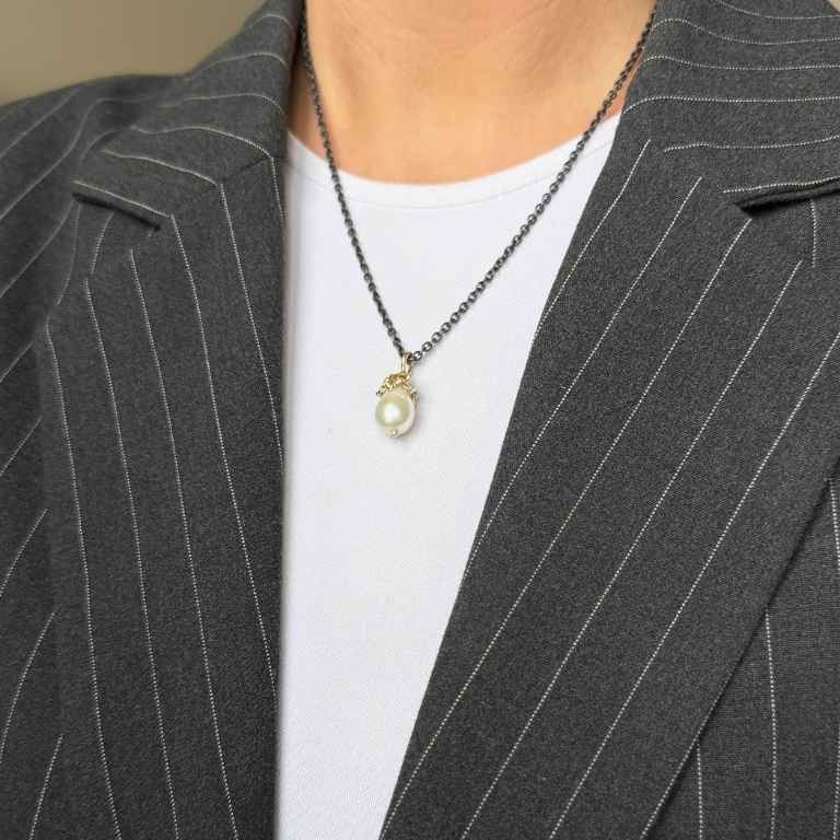 Smukt vedhæng fra By Birdie som forener rå elegance med kunstnerisk finesse. Vedhænget er udført i 925 sterlingsølv belagt med 18 karat guld. Birdies ikoniske look kommer til syne gennem de afskallede områder så man kan se ind til det sortrhodinerede sølv. Alt sammen forenes organisk omkring den smukke hvide ferskvandsperle.