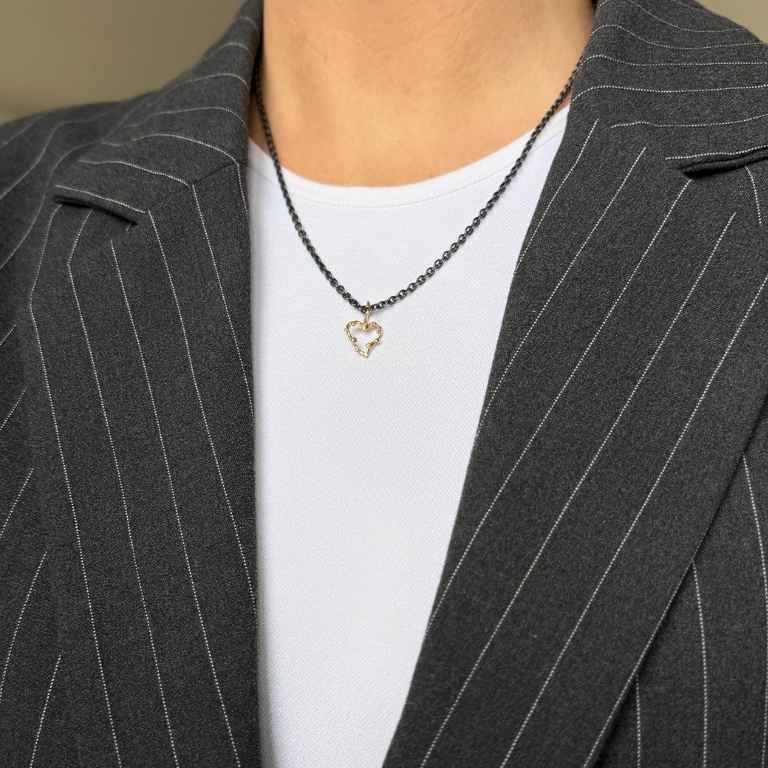 Dette elegante hjertevedhæng i 14 karat guld er et smukt symbol på kærlighed og skønhed. Håndlavet med små hammerslåede guldkugler, der symboliserer rosenknopper, tilføjer dette vedhæng et unikt og raffineret touch til din smykkesamling. Med en højde på 13 mm er det ideelt til både hverdag og særlige lejligheder. Kombinér det med en matchende guldhalskæde for et fuldendt look.