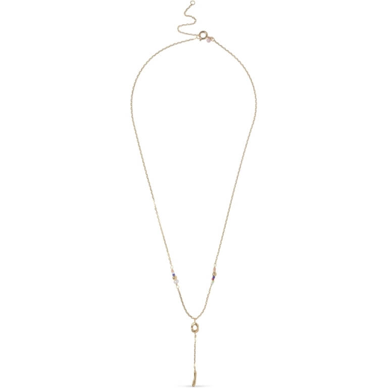 Dorothea-halskæden forener et legende og friskt udtryk med elegante detaljer, hvor farverige miyuki-perler smukt kombineres med skinnende polerede guldelementer og små ferskvandsperler. Det særlige Y-design skaber et elegant fald og giver en let forlængende effekt på halsen, som fremhæver smykkets feminine udtryk. Det organiske midterstykke med den fine ring tilfører et skulpturelt præg, mens kædens afslutning skaber bevægelse og lethed. De farvede perler tilfører en ungdommelig energi, der står i flot kontrast til guldkædens klassiske og tidløse elegance. Dorothea er et smykke, der forener farver, legende detaljer og raffineret design i én harmonisk helhed. Halskæden er desuden perfekt at style med andre kæder – for eksempel en kortere, enkel halskæde – for at skabe et smukt og iøjnefaldende lag-på-lag look.