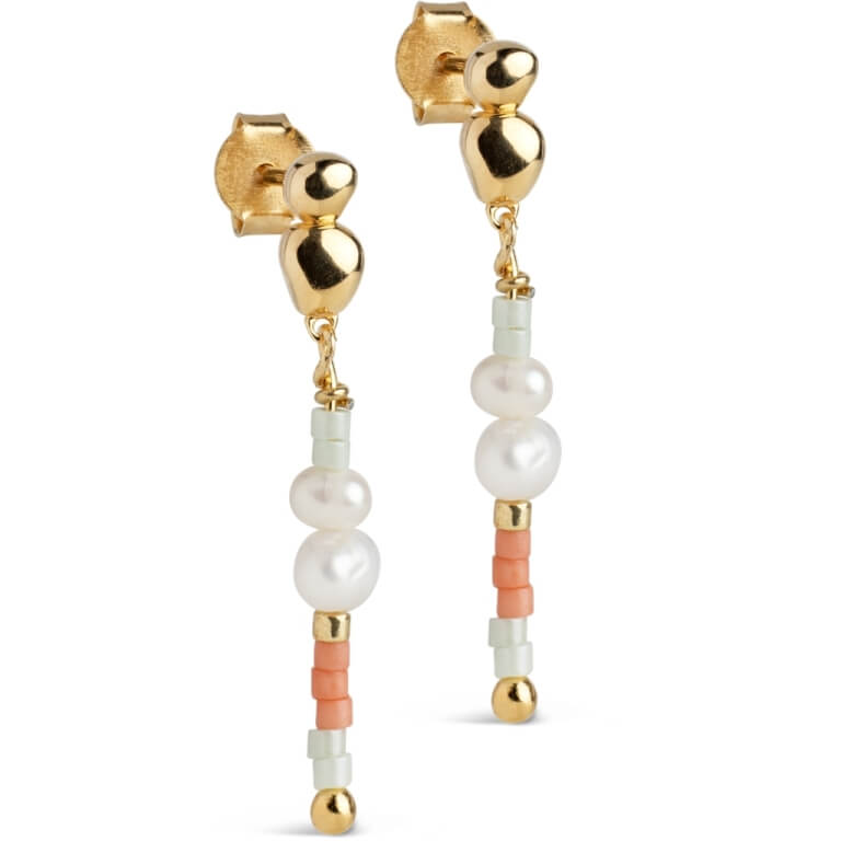 Nara Whimsically øreringene har et let og poetisk udtryk, hvor farver og materialer smelter sammen i en harmonisk balance. Øverst er der to bløde, højglanspolerede guldelementer, der giver et skulpturelt udgangspunkt. Herfra falder en kombination af små miyuki-perler, blandet med skinnende ferskvandsperler, der tilføjer et naturligt og feminint touch. En ørering, der udstråler legende elegance og giver ethvert outfit et friskt strejf af lys og liv.