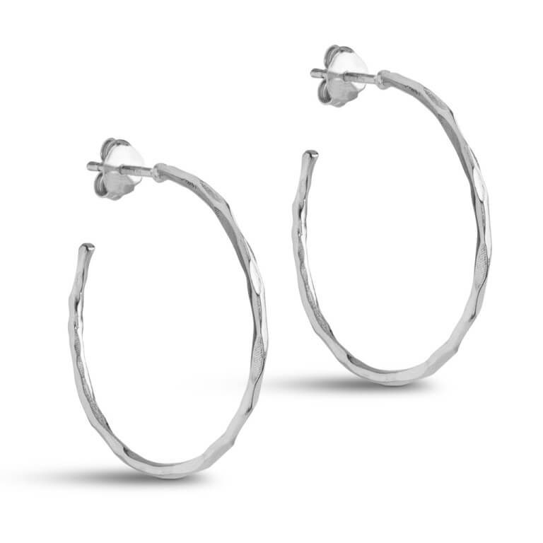 Organic Arena Medium hoops i 925 sterlingsølv kombinerer enkelhed med rå elegance og fås i tre forskellige størrelser. Den hamrede sølvoverflade skaber et organisk og livligt lysspil, der indfanger lyset på en subtil og sofistikeret måde. Trods deres slående udtryk er de utroligt lette. Deres tidløse design gør dem ideelle som basisøreringe, der kan bæres igen og igen. Perfekte til at skabe et personligt look, uanset om du vælger én størrelse eller leger med flere sammen. Organic Arena Medium fås også belagt med 18 karat guld.