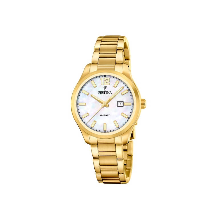 Flot og klassisk dameur udført i gulddoubléfarvet rustfrit stål. Uret har en smuk perlemorsskive med tydelige visere og indeks der matcher resten af uret. Derudover er modellen vandtæt ned til 50 meter. Urets enkelthed og elegante design gør det perfekt til ethvert outfit.