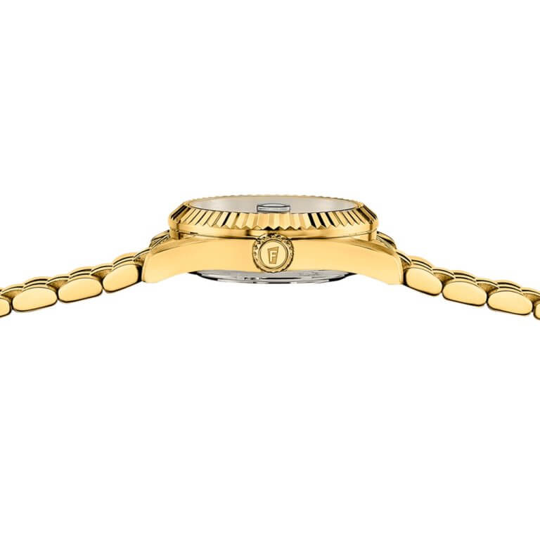 Elegant og klassisk dameur fra Festina med en flot hvid perlemorsskive prydet med funklende krystaller, og en behagelig lænke i gulddoubléfravet rustfrit stål. Urkassen er samtidig tynd og den passer flot i forlængelse med den kvalitetsprægede lænke. Uret har schweizisk urværk, ridsefast safirglas og datovisning. Derduover er det vandtæt ned til 100 meter.