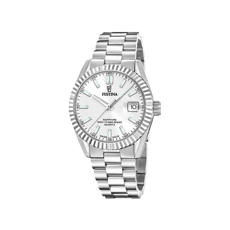 Stilfuldt og sporty herreur fra Festina med en klassisk sølvfarvet skive og en behagelig lænke i rustfrit stål. Urkassen er samtidig tynd og den passer flot i forlængelse med den behagelige lænke. Uret har schweizisk urværk, ridsefast safirglas og datovisning med lup. Derduover er det vandtæt ned til 100 meter.