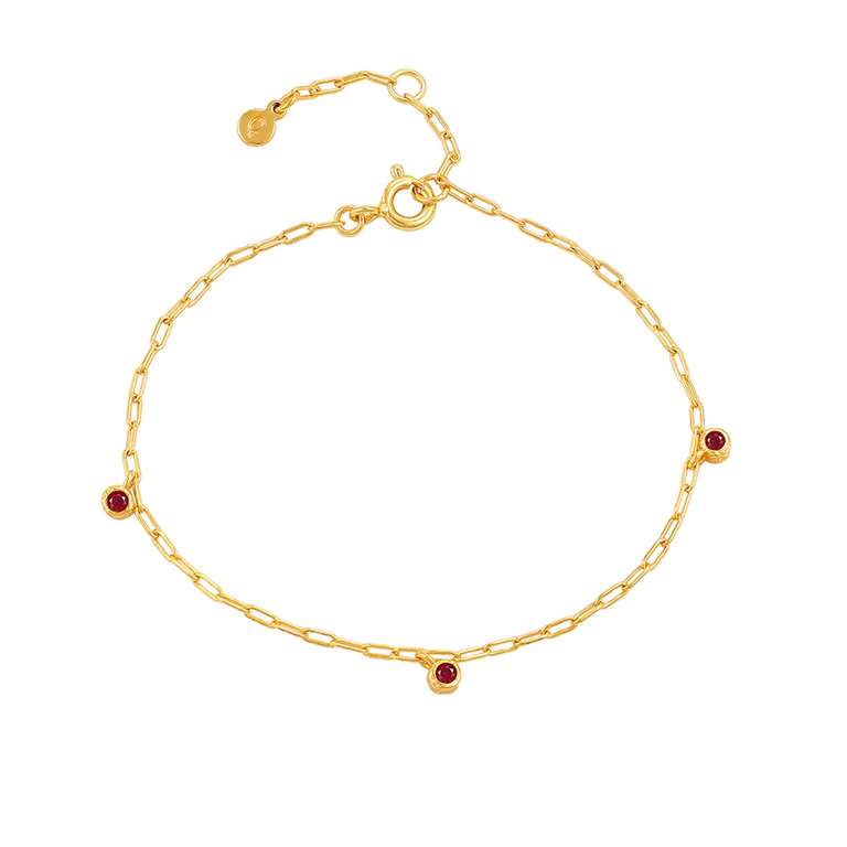 Amber er et elegant kædearmbånd prydet med vedhæng med funklende røde zirkoniasten. Vedhængene er nænsomt fordelt langs armbåndet for maksimal effekt. Bær det alene eller kombinér det med andre skønne armbånd fra Hultquist.