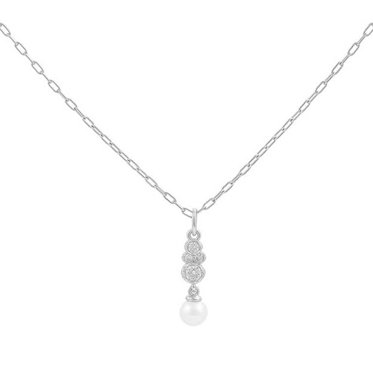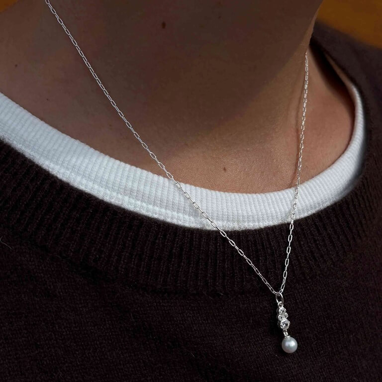 Scarlet er en smuk halskæde med et elegant vedhæng prydet med funklende klare zirkoniasten i forskellige størrelser og en smuk hvid ferskvandsperle der hænger frit nederst. Det elegante design fanger lyset smukt og giver et sofistikeret look, mens materialets kvalitet sikrer komfort og holdbarhed. Perfekt både til hverdagsbrug og særlige lejligheder.