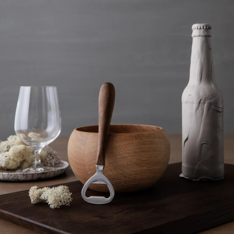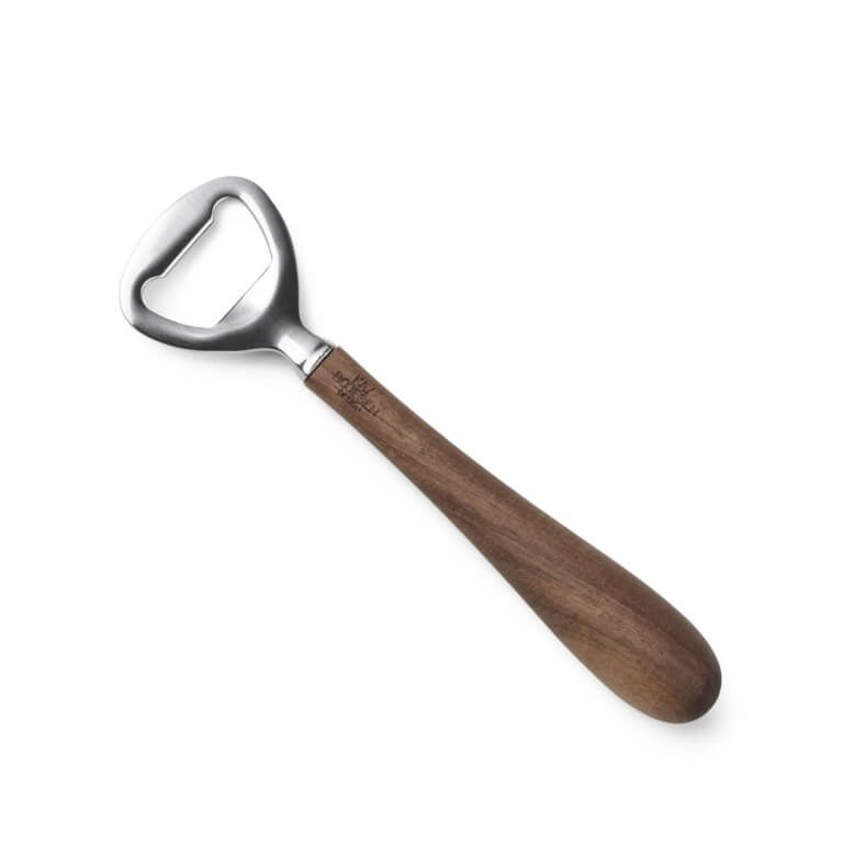 I Menageri-serien kommer her en oplukker i mørk valnød, der giver et eksklusivt look. Den er smukt forarbejdet og rar at røre ved, så du både får en æstetisk og en taktil oplevelse, når du åbner en flaske. Grebet er lækkert og oplukkeren ligger godt i hånden. Du både ser og fornemmer tydeligt Kay Bojesens velkendte runde og bløde formsprog, der er hans signatur. Samlere og kendere vil kunne genkende oplukkeren, der er det originale design fra Kay Bojesens hånd, der nu genintroduceres i mørk valnød, som står i flot kontrast til det blanke stål. Et lille diskret logo er præget i træet, der er behandlet med olie. Det bringer årerne i træet frem og gør træet slidstærkt.