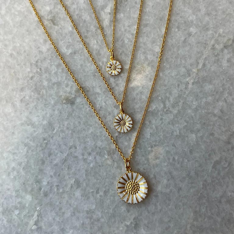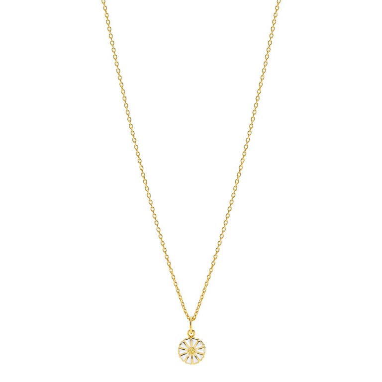 Klassisk rund ankerkæde prydet med en margueritblomst med hvid emalje. Blomsten måler 9 mm i diameter. Begge dele er udført i 925s sterlingsølv belagt med 24 karat guld.