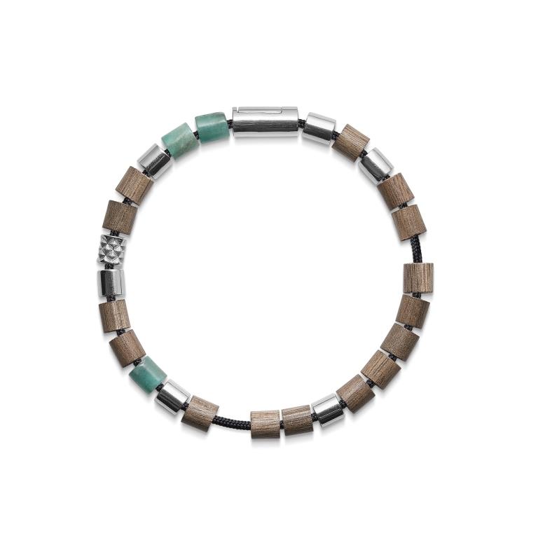 Dette fede armbånd er sammensat af et armbånd i sort nylon med sølv lås, og perler i sølv, smaragd og matchende drivtømmer perle i grå nuancer.
