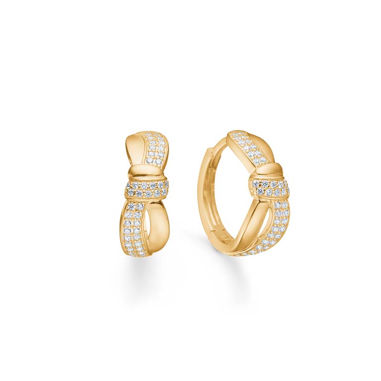Designer Mads Ziegler forener bløde, organiske former med grafisk geometri og skaber et øreringedesign, hvor en markant knude udgør det kunstneriske midtpunkt. To parallelle rækker af pavé-satte zirkonia forløber på begge sider af creolens midte, hvilket giver et sammenhængende bånd af glimtende lys. Den rolige helhed understreges af helblankpolerede overflader og præcise overgange, der afspejler White Label-kollektionens stræben efter tidssvarende luksus i ægte guld. Hvert element vidner om omhyggelig opmærksomhed på detaljen og eksklusivt dansk design.
