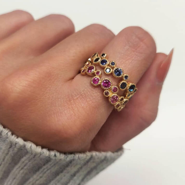 Mads Z` ikoniske Luxury Rainbow ring har fået et twist, og er i denne udgave udelukkende prydet med ædelsten i røde og lilla nuancer.