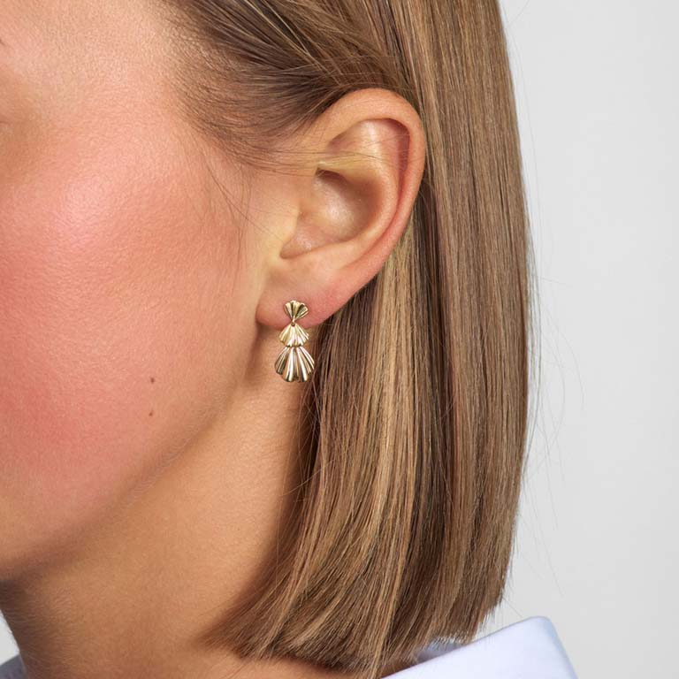 Velvet øreringe i 14 karat guld måler 20 mm og forener arkitektonisk skulptur og organisk inspiration i et distinkt dansk design.