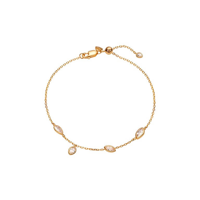 - Delikat kæde-armbånd med flydende hvide zirkonia-sten i marquise- og pæreformede slibninger.