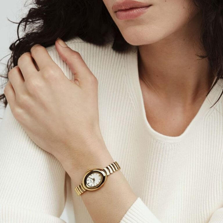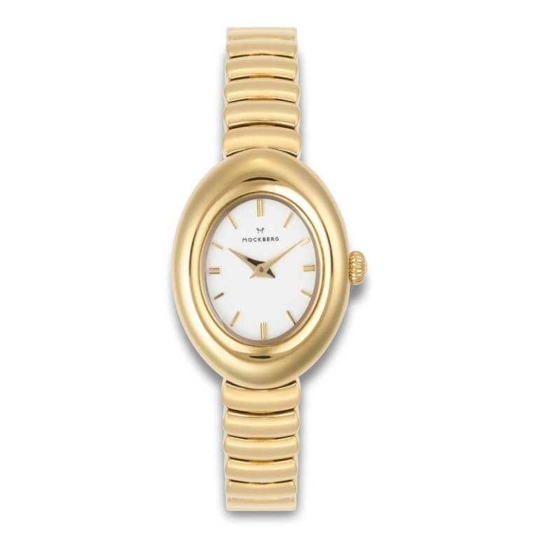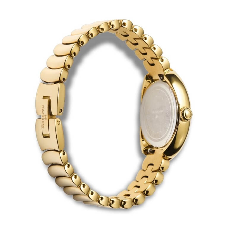 Elegant dameur fra det anerkendte svenske urmærke, Mockberg. Uret er designet med en smuk oval urkasse og en klassisk hvid skive med fine detaljer. Uret har en behagelig og stilren lænke i gulddoubléfarvet rustfrit stål som er udstyret med tre hasper så man selv nemt kan afkorte uret så det passer i størrelsen.