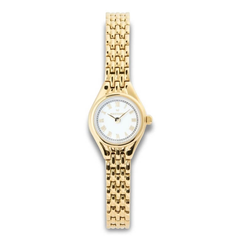 Elegant og ikonisk dameur fra det anerkendte svenske urmærke, Mockberg. Uret er designet med en smuk takket krans og en klassisk hvid skive med fine detaljer. Uret har en behagelig og stilren lænke i gulddoubléfarvet rustfrit stål som er udstyret en haspelås i god kvalitet.