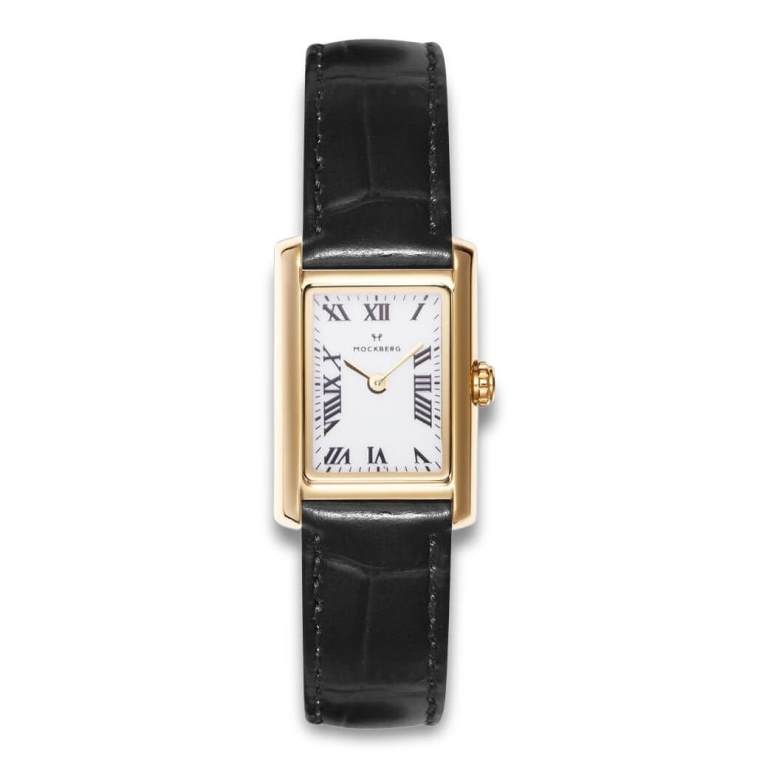 Elegant og ikonisk dameur fra det anerkendte svenske urmærke, Mockberg. Uret er designet med en smuk firkantet urkasse og en klassisk hvid skive med fine detaljer. Uret har en behagelig og stilren sort læderrem i god kvalitet.