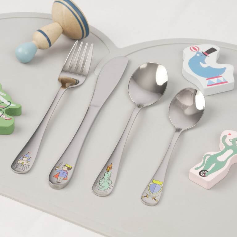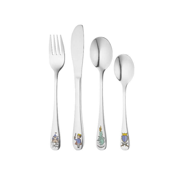 Sødt bestiksæt til de mindste, pyntet med farverige emaljebilleder. Bestikket er udført i rustfrit stål og tåler maskinopvask.