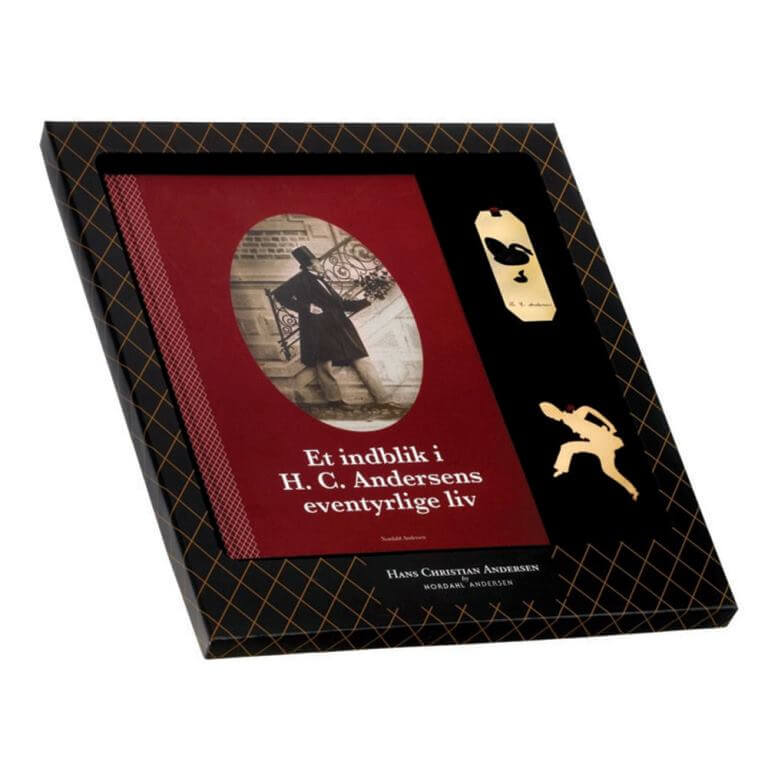 Bogen leveres i en fin gaveæske, som også indeholder et bogmærke med Den grimme ælling samt et ophæng, som siges at være H.C. Andersens selvportræt.