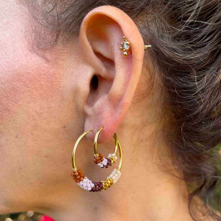 Håndlavede hoop øreringe i 24 karat forgyldt sterlingsølv prydet med japanske Miyuki glasperler i en smuk farvesammensætning. Øreringene måler 30 mm i diameteren.