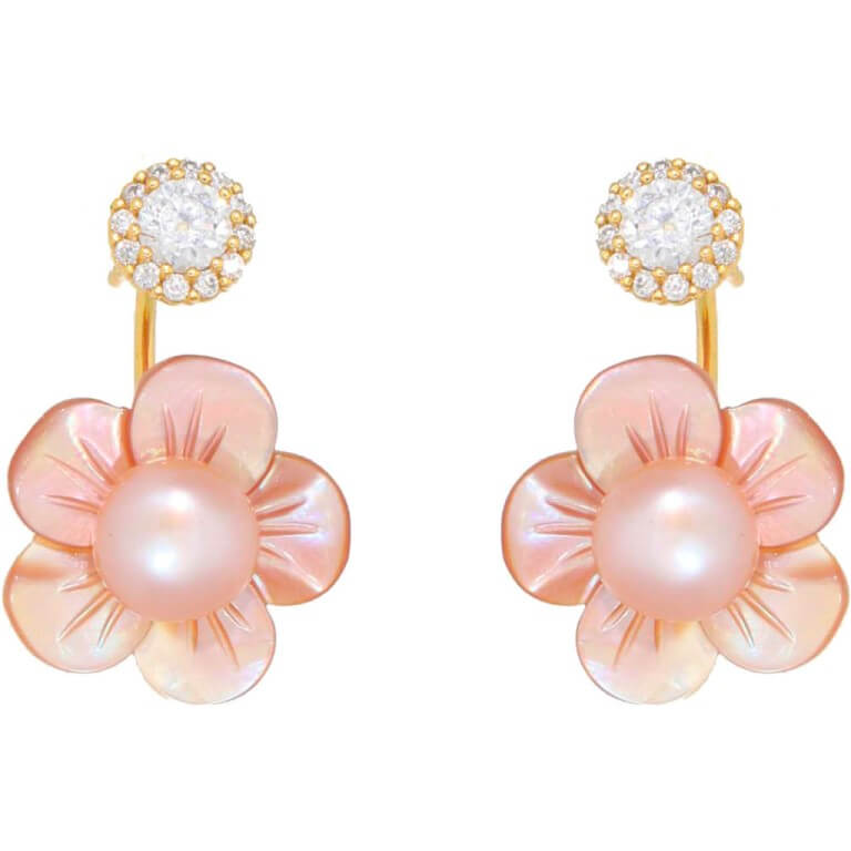 Mabel Rose er et par søde øreringe med smukke farver og en fin behind-ear effekt. Øreringene er prydet med funklende klare zirkonia-sten på stikken, samt en behind-ear med en flot blomst og perle med rosa perlemorsoverflade.