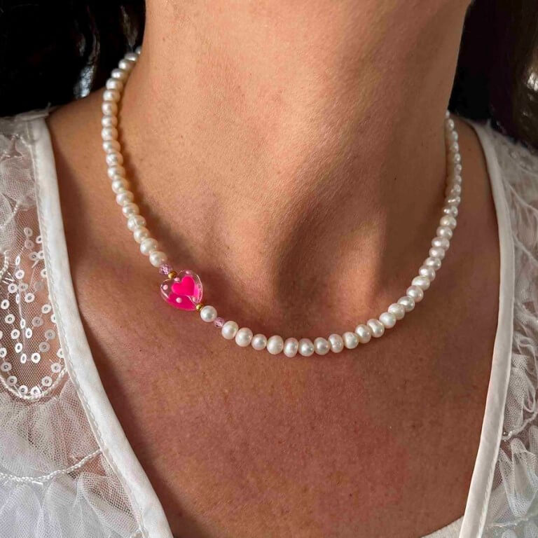 Rosalia er en smuk og farverig håndlavet halskæde i 24 karat forgyldt genanvendt sterlingsølv 925 prydet med hvide ferskvandsperler og glasperler.