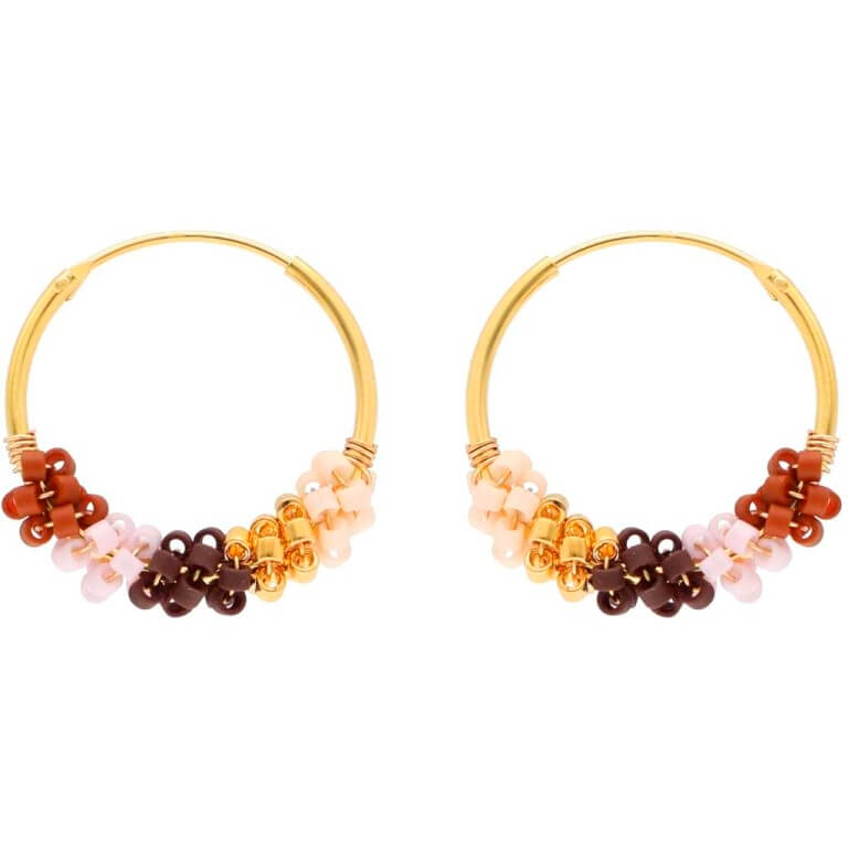 Håndlavede hoop øreringe i 24 karat forgyldt sterlingsølv prydet med japanske Miyuki glasperler i en smuk farvesammensætning. Øreringene måler 20 mm i diameteren.
