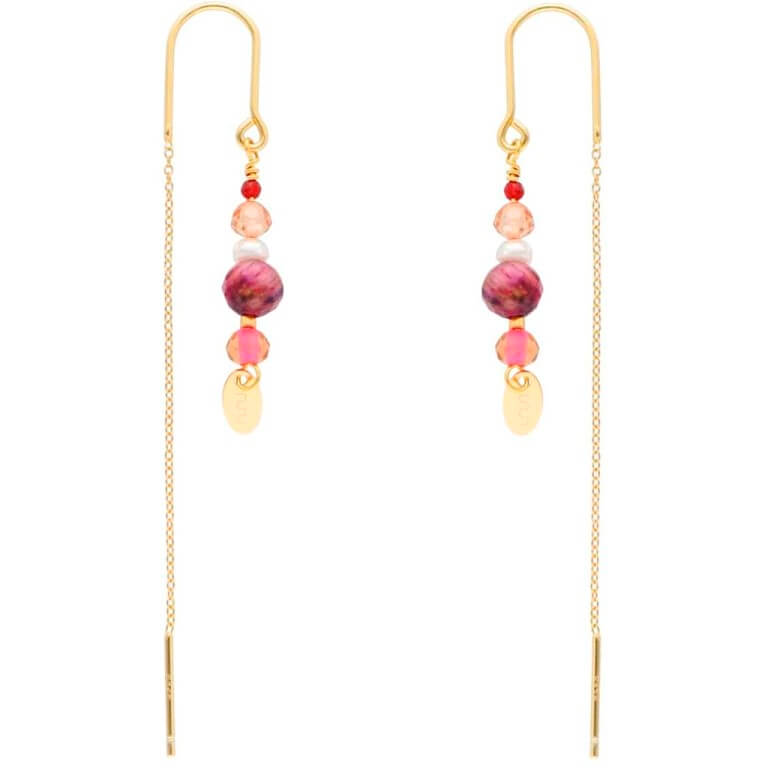 Sirene Burgundy er et par smukke og farverige kædeøreringe med masser af liv. De er håndlavet i 24 karat forgyldt sterlingsølv, og er prydet med ferskvandsperler, halvædelsten og zirkonia. Alle de smukke sten samt coin-vedhænget danser frit fra bøjlen øverst.