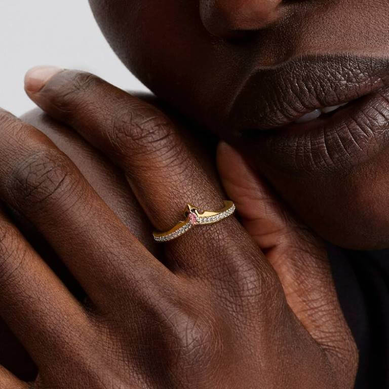 Lige så strålende som Disneys Auroras hjerte. Ringen er belagt med 14 kt. guld og er designet til at ligne en tiara. Med en pink oval midtersten indfanger den hendes yndefulde og kærlige væsen. Kan stackes med Malavias ring dess. pa194333C01.