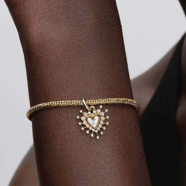 Lys dit look op med dette to-tonede charm med vedhæng. Designet består af ét åbent hjerte omgivet af funklende stråler og ét med en skjult indgravering med ordene "MY RAY OF LIGHT". Bær det. Del det. Strål sammen.