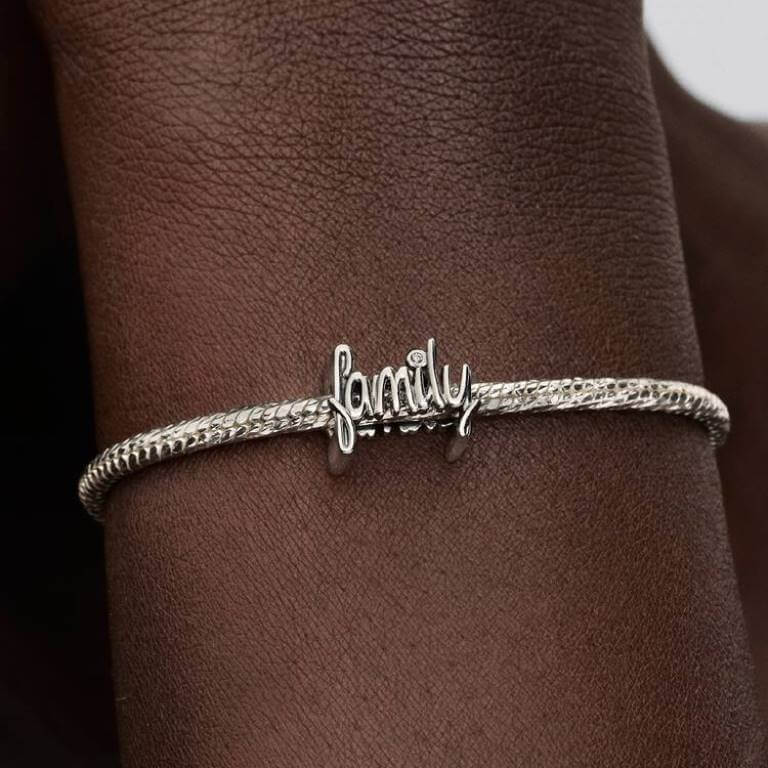 En skinnende påmindelse om, hvad der betyder mest. Dette charm i sterlingsølv består af ordet "family" skrevet i hånden, og prikket over i'et er en sten i kubisk zirkonia. Det er smukt udført og er en tidløs hyldest til hjertet i enhver historie.