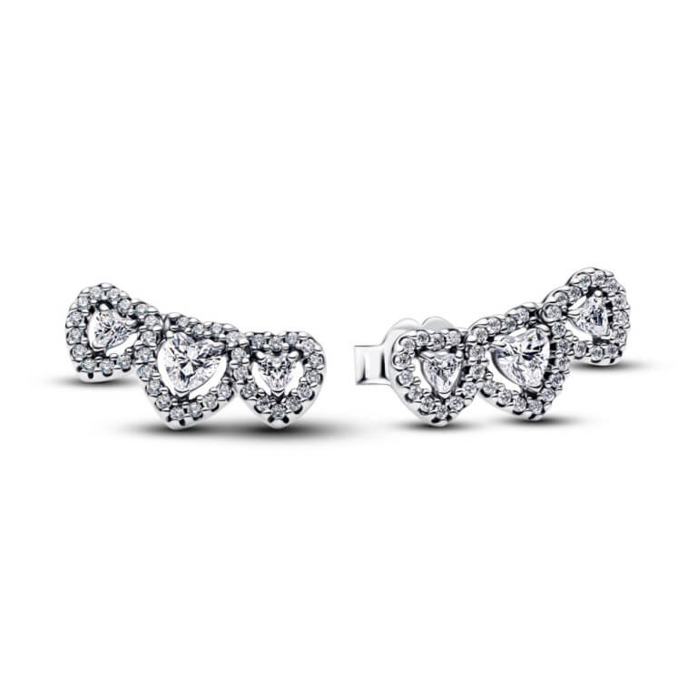 Udstrål kærlighed. Disse ørestikker i sterlingsølv har tre hjerteformede sten, der er forbundet af en halo af funklende pavé. Den perfekte gave til dig selv eller en, du holder af.