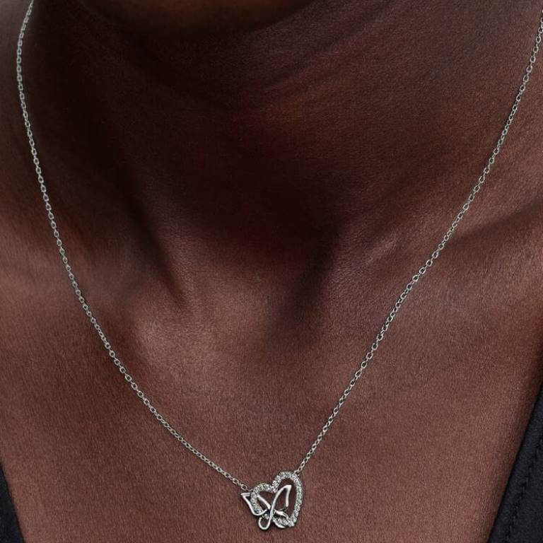 En sommerfugle-forelskelse. Pandoras åbne halskæde består af et hjerte i sterlingsølv, der er flettet sammen med en sommerfugl og indfattet med funklende sten. Bær det som en påmindelse om, at kærlighed og natur er dybt forbundet.