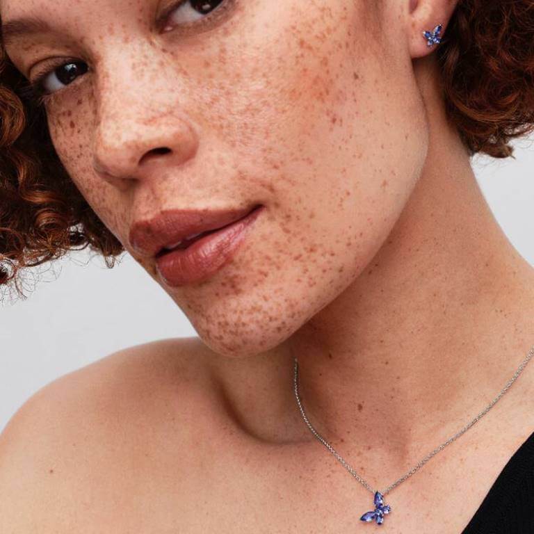 Spred dine vinger, og forvandl dit look med denne halskæde i sterlingsølv. Fra kæden hænger en sommerfugl på elegant vis. Den er indfattet med blå marquiseslebne og pæreformede syntetiske krystaller.
