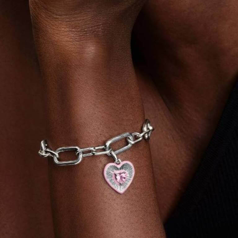 Strål indefra. Dette medaljoncharm i sterlingsølv har en pink hjerteformet krystal indrammet i emalje med et dobbeltsidet design, der symboliserer kærlighedens indre lys.