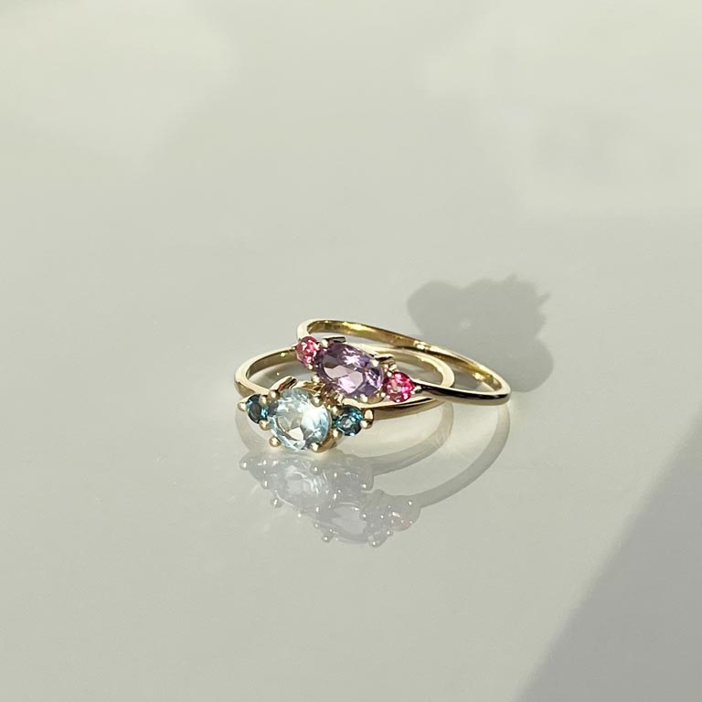 Denne smukke ring fra Scrouples er håndlavet i 8 kt. guld og prydet med både blå topas og London blue topas.