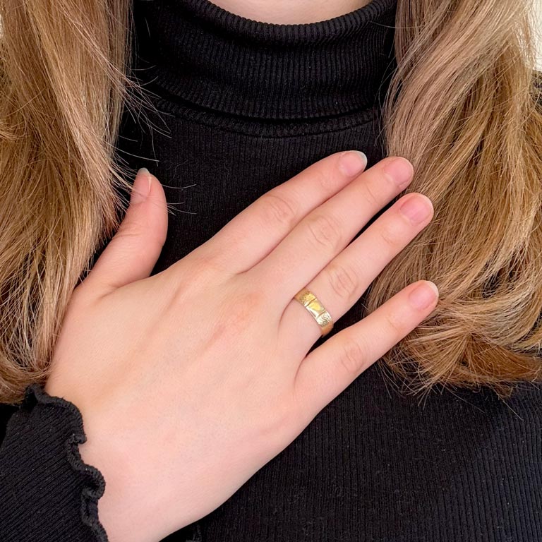 Ring udvendig firkantet, blank / hamret i 14 kt. guld fra Collection Pind J