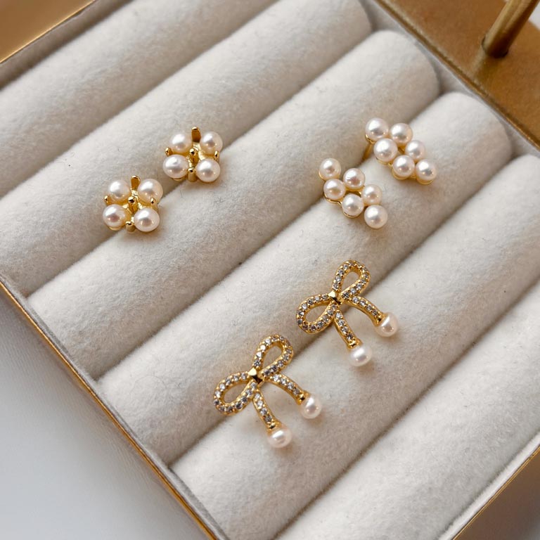 Små og elegante ørestikker i forgyldt sølv med fire ferskvandskulturperler samlet i en tæt, blomsterlignende form. Det enkle design giver et roligt og klassisk udtryk med en blød fylde.