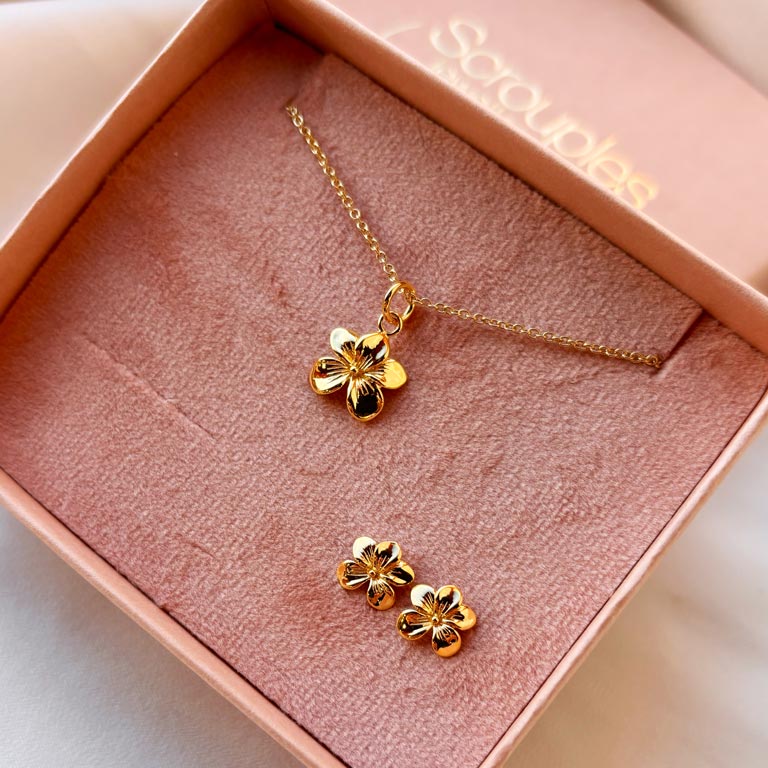 Et hjertevarmt og yndigt smykkesæt – dette Pixel smykkesæt fra Scrouples i forgyldt sølv er skabt med omtanke og charme. Blomstermotivet emmer af lethed og leg, hvilket gør sættet ideelt som barnets første smykker.