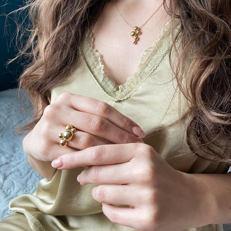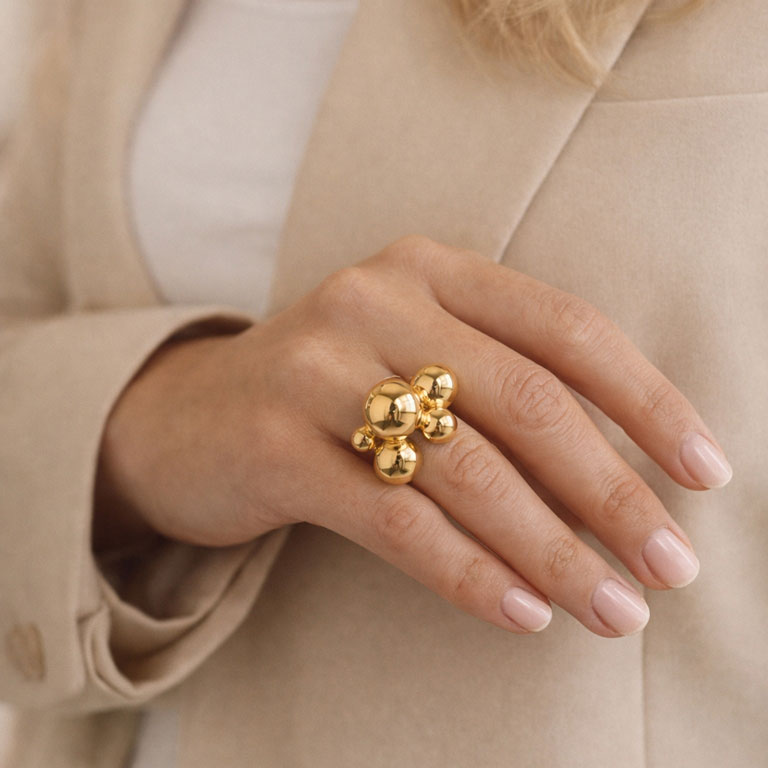 Ringen er designet til at skille sig ud, men samtidig være alsidig nok til at kunne bæres sammen med andre smykker. De forskellige kugler reflekterer lyset smukt og tilføjer en dynamisk effekt til dit look. Uanset om du kombinerer den med andre smykker eller lader den tale for sig selv, vil denne ring være et stilfuldt og sofistikeret valg.
