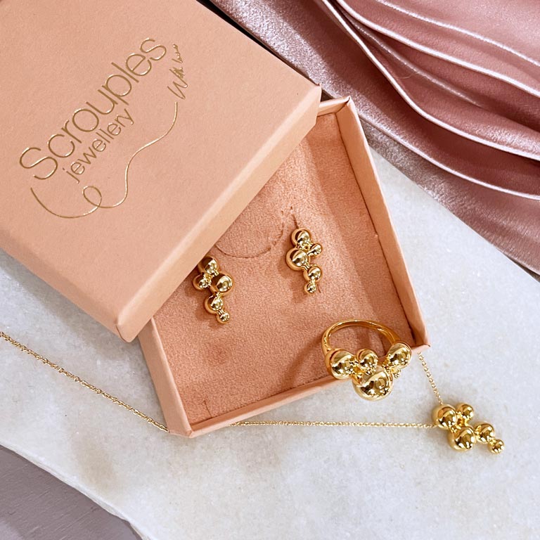Oplev tidløs elegance og moderne design med denne fantastiske ring fra Scrouples. Fremstillet i forgyldt sølv, er denne ring prydet med flere kugler i forskellige størrelser, der skaber en unik og iøjnefaldende struktur. Det skinnende forgyldte sølv giver et luksuriøst udtryk, der passer perfekt til både hverdag og festlige begivenheder.