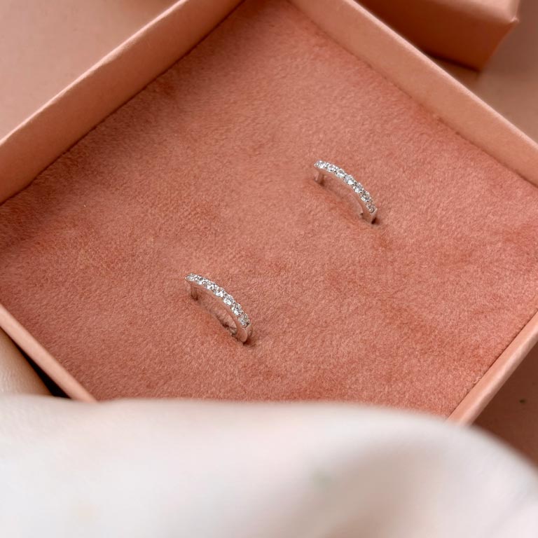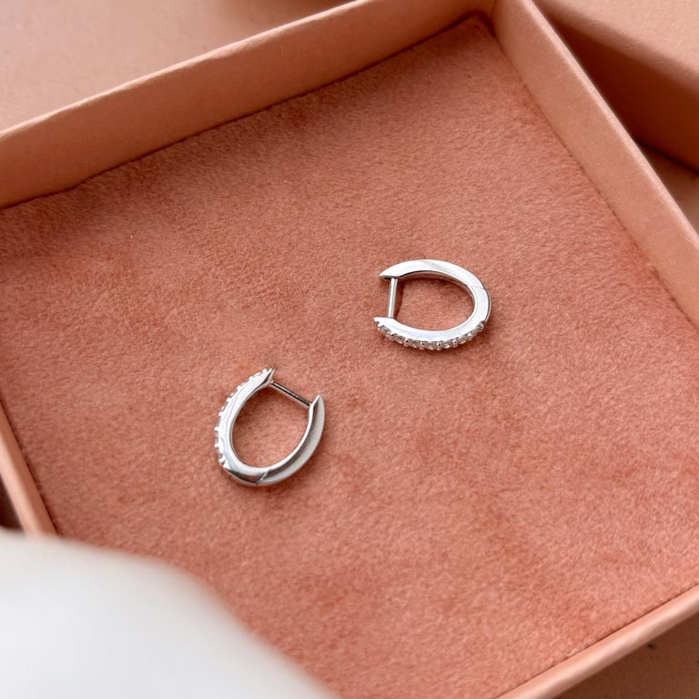 Øreringene sidder tæt til øret og har en enkel kliklås, som gør dem nemme at tage af og på. De fungerer både som et stilrent hverdagssmykke og til pænere brug.
